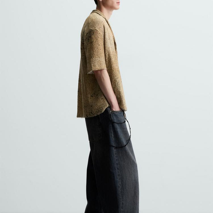 Relaxed fit knit shirt made from a cotton blend yarn. Featuring a camp collar, short sleeves, and an button-up front. Irregular hem