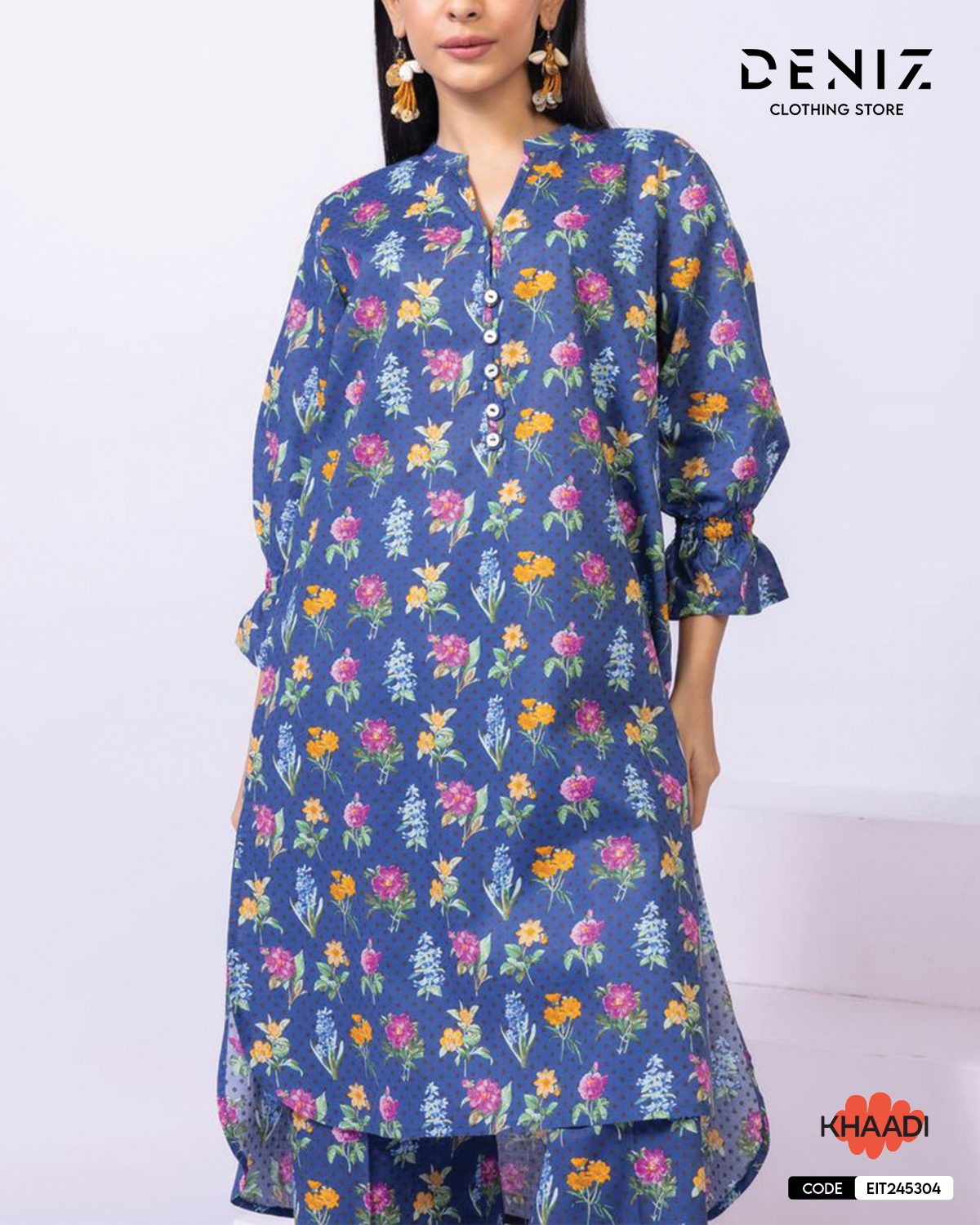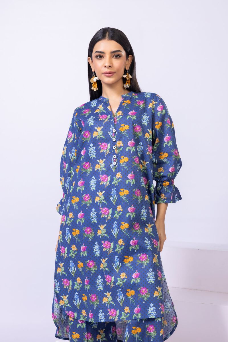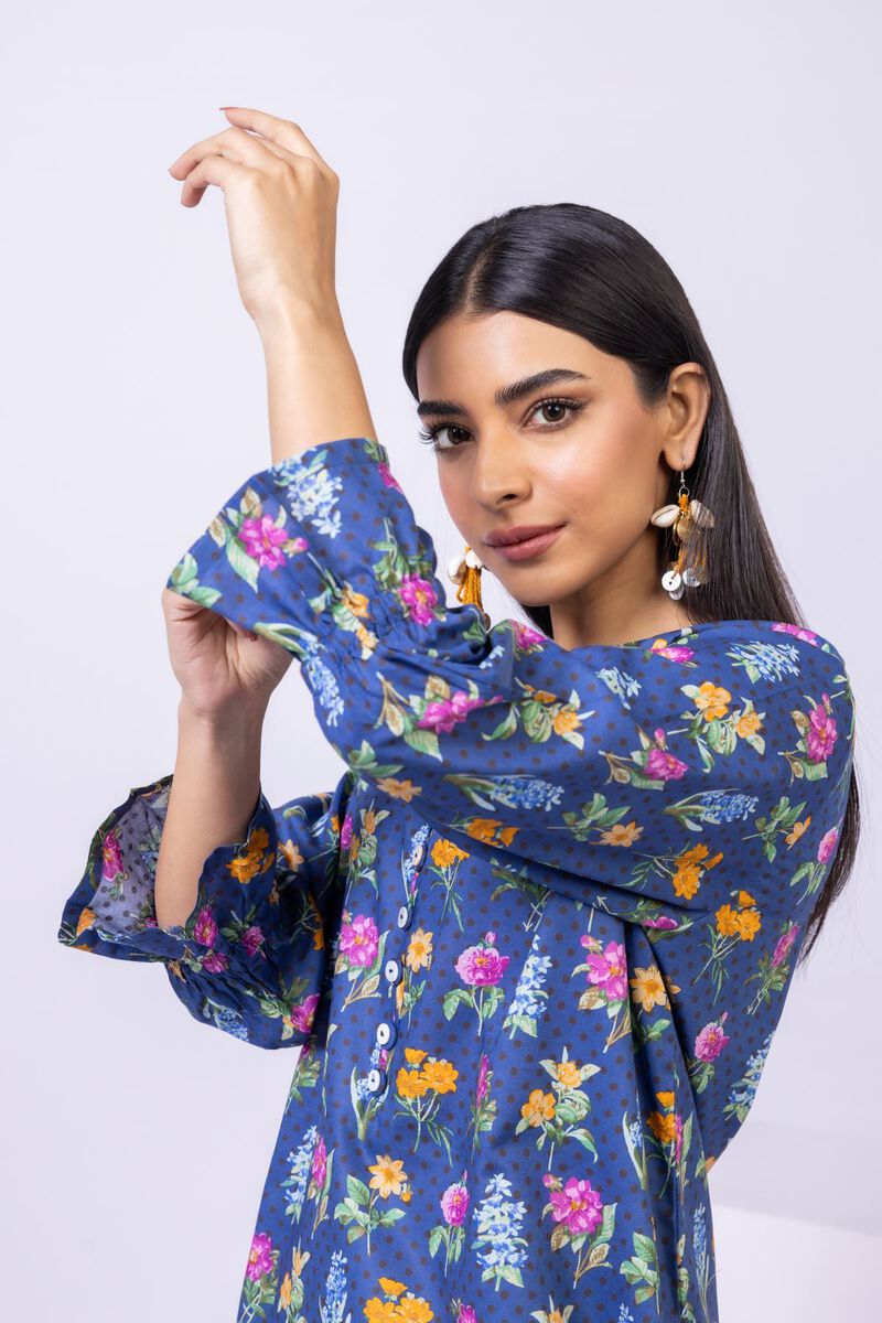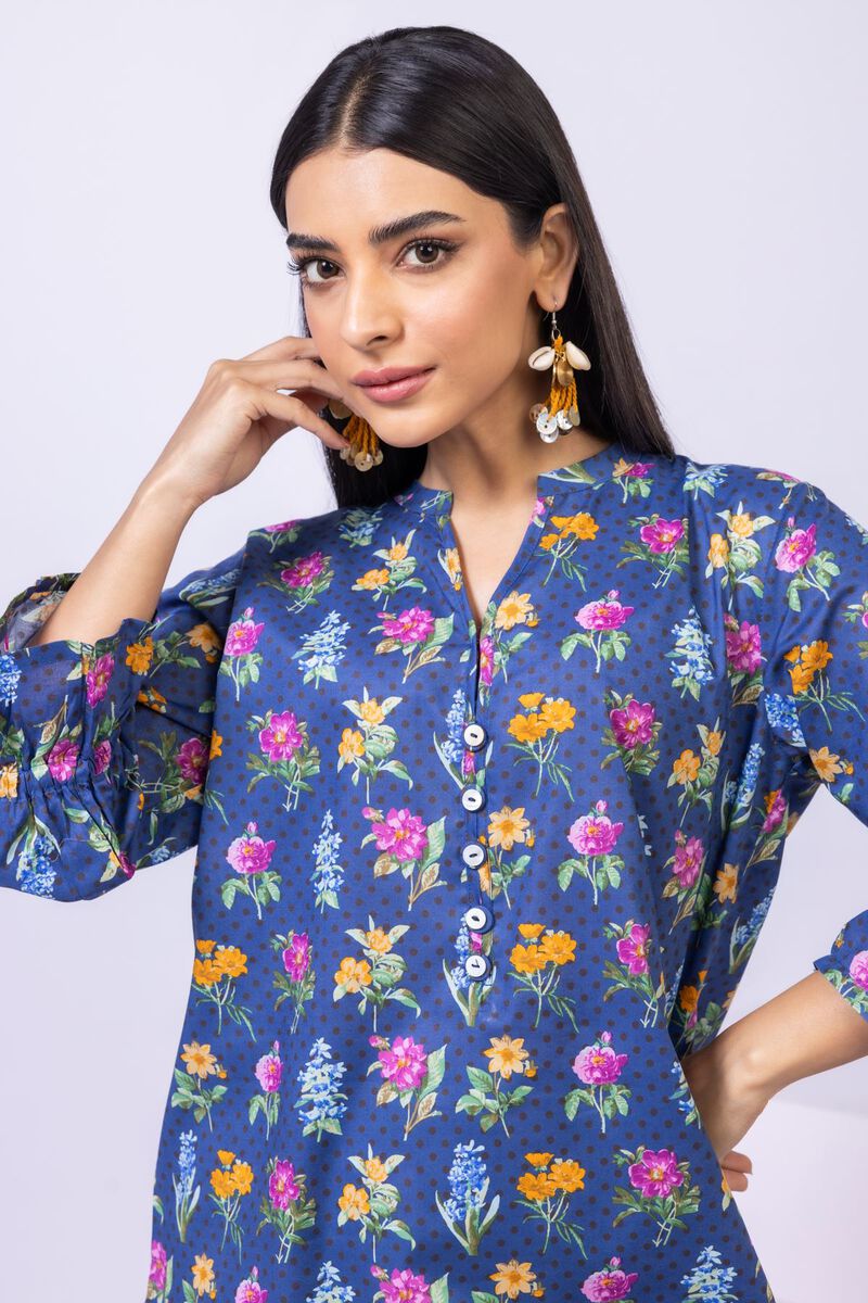• Description: A floral printed kurta featuring three quarter sleeves, a band collar with a slit, buttons on the neckline and a rounded hem.