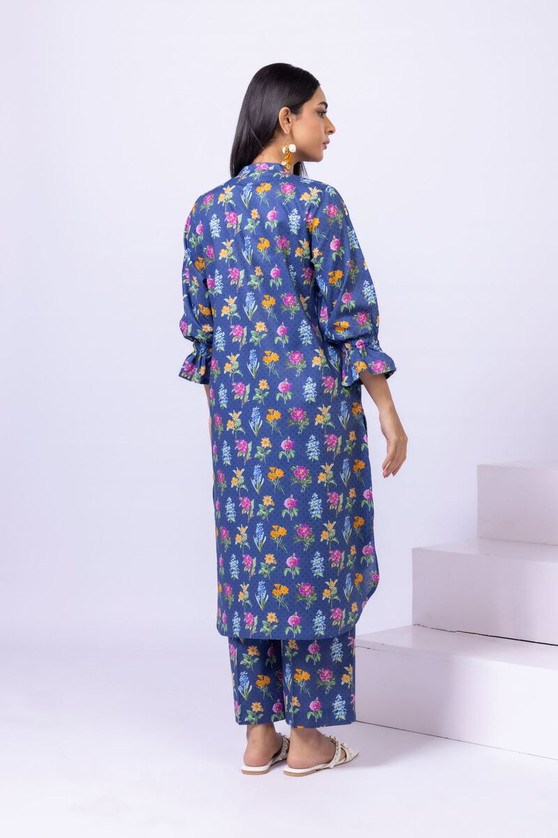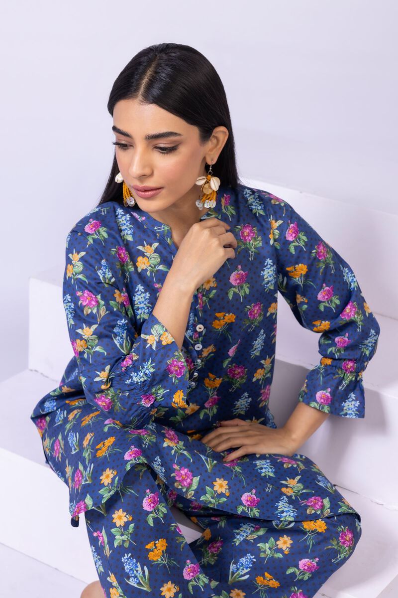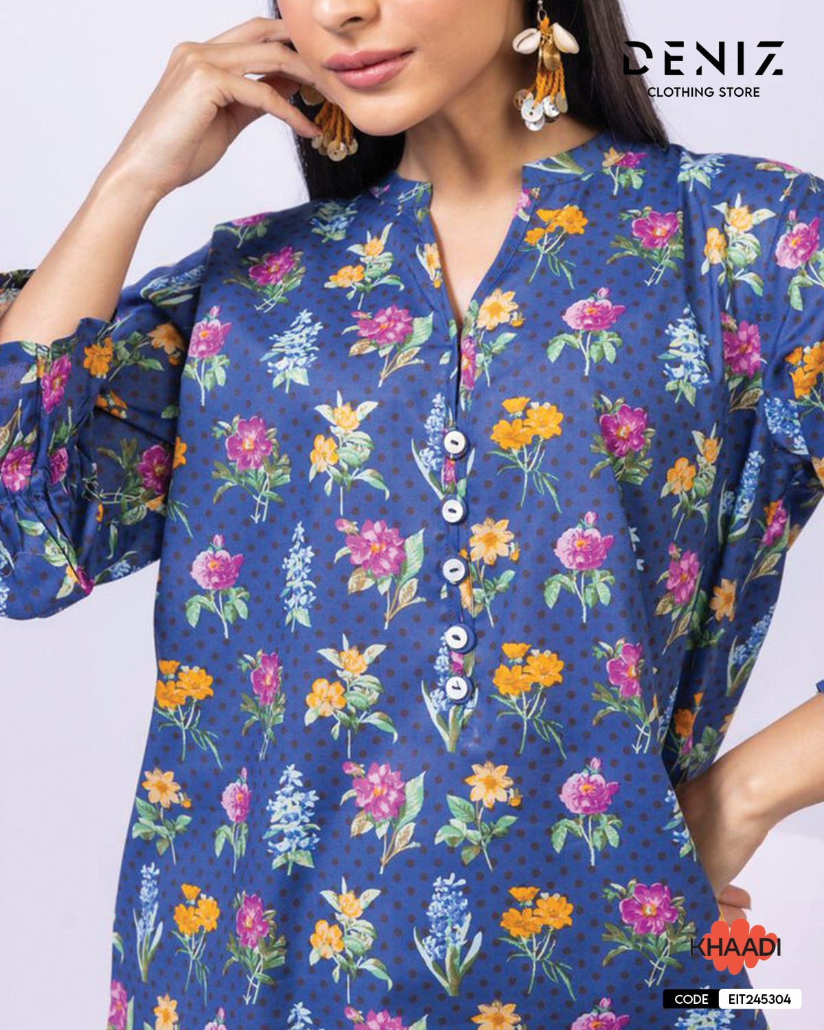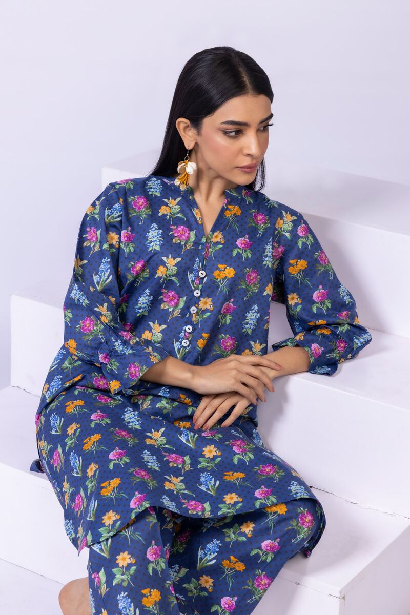 • Description: A floral printed kurta featuring three quarter sleeves, a band collar with a slit, buttons on the neckline and a rounded hem.